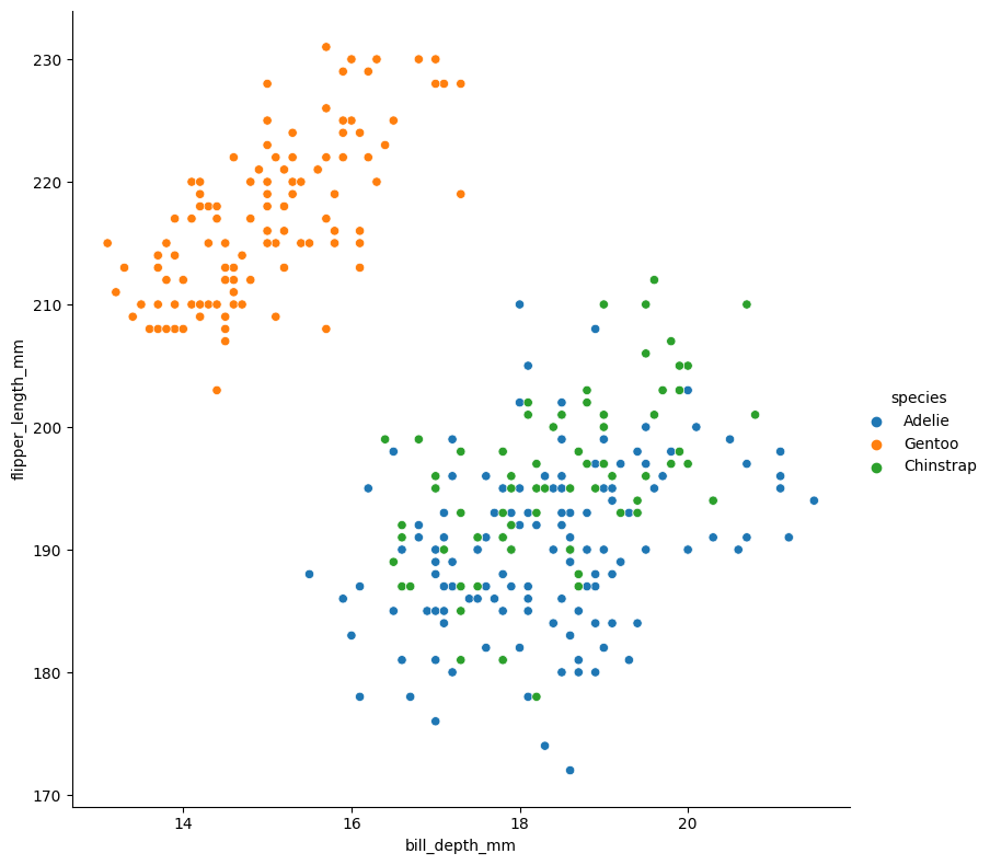 One scenario is where the dividing lines between groups aren’t simply horizontal or vertical. For example, here’s a scatter plot that uses bill depth instead of bill length: